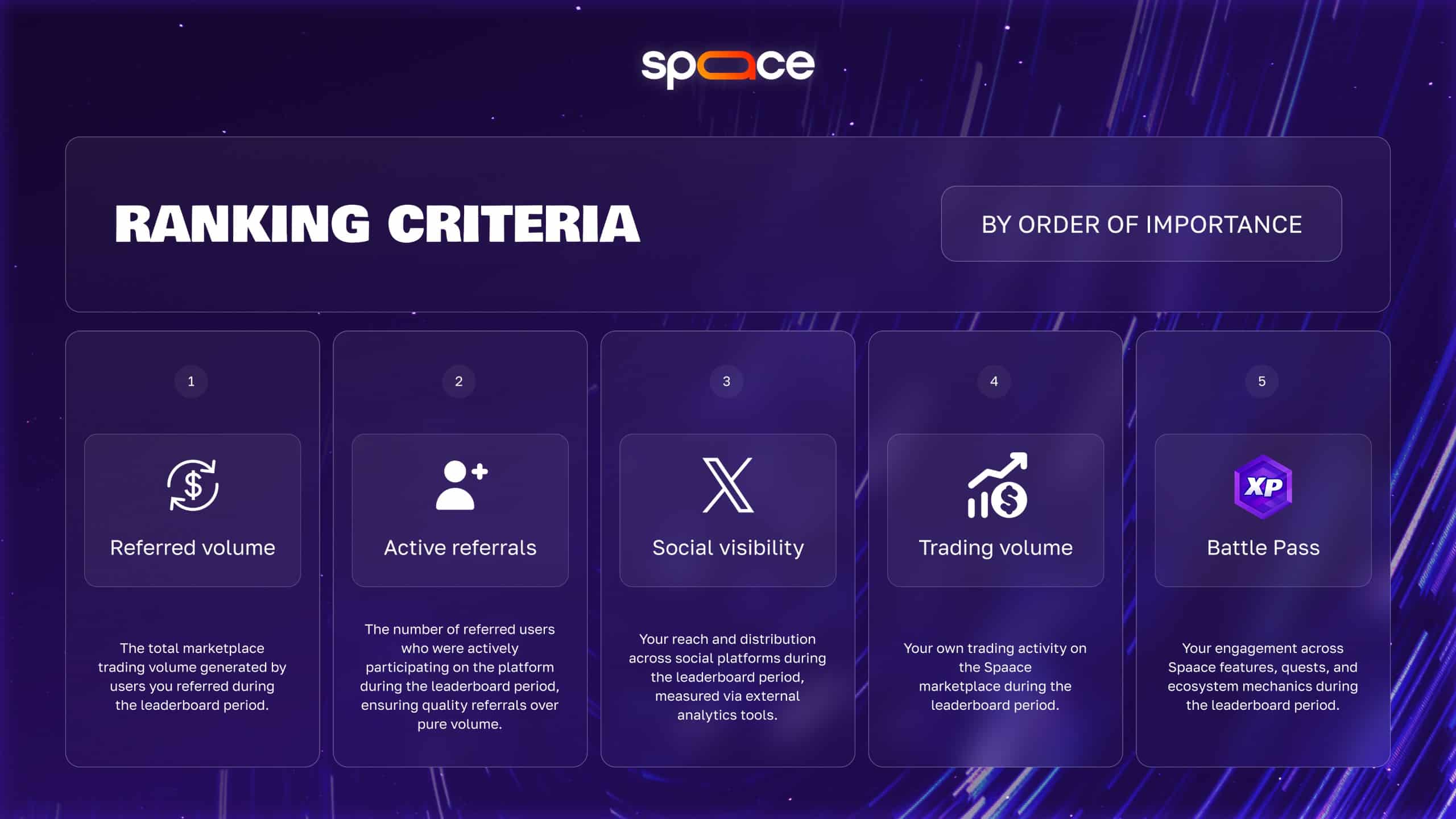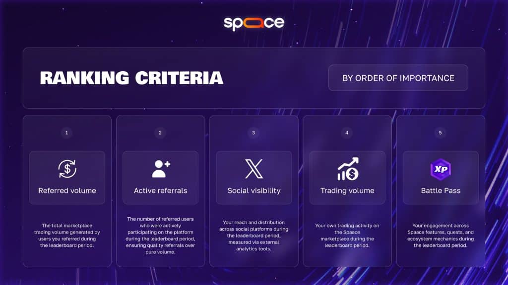 Rankings are based on a set of performance indicators measured over the current leaderboard period. Each criterion reflects a tangible contribution to the growth of the Spaace ecosystem.